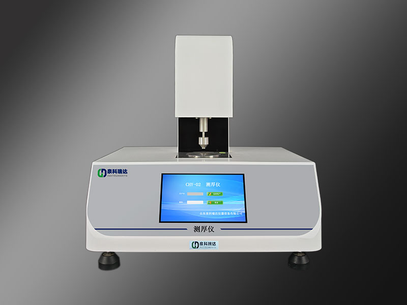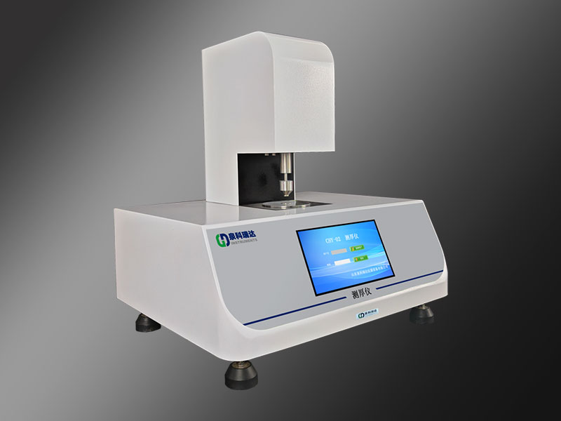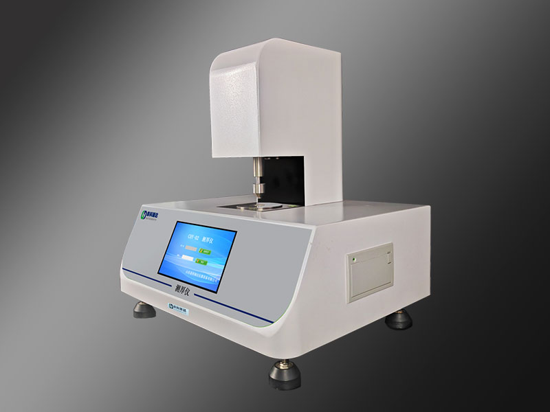 本品不同于超聲波,電渦流等原理,采用機械接觸式厚度測量方式進行厚度的高精度測量,完全符合標準要求;將厚度測量頭復位后置零(測厚頭與測厚儀測試臺接觸歸零),啟動試驗,測厚頭達到最高位,將平整試樣置于測厚儀測試平臺上,測量頭下落后接觸試樣,對試樣施壓標準規(guī)定的壓力后通過位移傳感器記錄材料厚度。