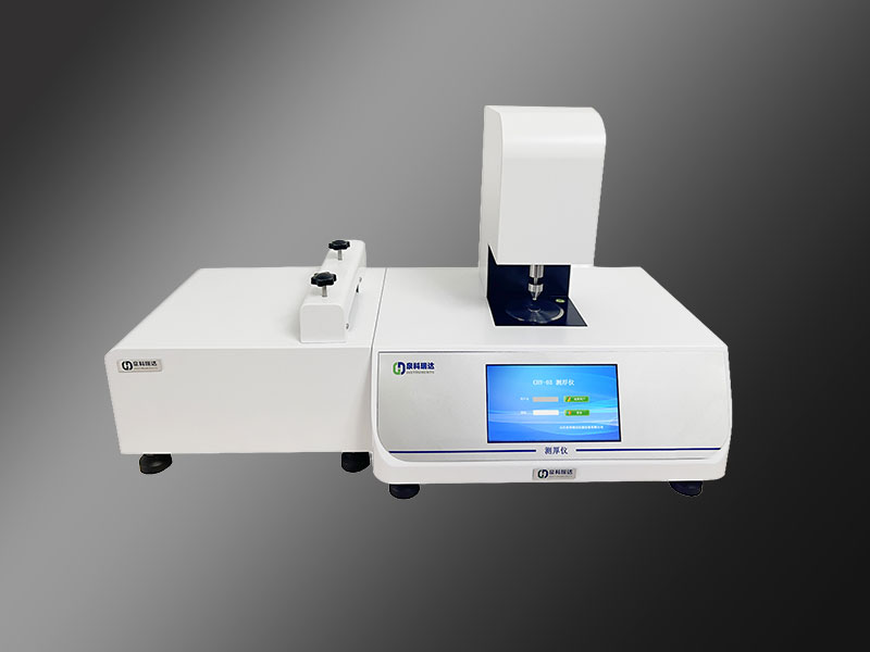 本品采用機械接觸式厚度測量方式進行厚度的高精度測量;將厚度測量頭復位后置零(測厚頭與測厚儀測試臺接觸歸零),啟動試驗,測厚頭達到最高位,將平整試樣置于測厚儀測試平臺上測量頭下落后接觸試樣,對試樣施壓標準規(guī)定的壓力后通過位移傳感器記錄材料厚度;自動進樣器按用戶設定的測試間距牽引試樣進給,至設定間距停止,測量頭下行測試厚度,按設定的間距數(shù)量儀器完成全自動厚度測試,并記錄測試過程數(shù)據(jù),在試驗結果后給出統(tǒng)計結果。