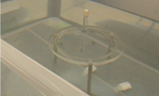 3、將氣體采裝置放入水箱中,完全去除裝置表面氣味,尤其是漏斗集氣管內(nèi)部的微小氣泡,以防止水中殘留氣體影響測試精度。將采集罩頂端用橡膠塞塞住并浸入水中,使細(xì)柱端向下,用金屬棒伸入采集罩的細(xì)柱內(nèi)輕輕攪動(dòng),使細(xì)柱內(nèi)部的空氣溢出;然后將其翻轉(zhuǎn)放置在支架上。
