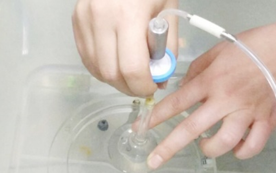6、在水中裝置下部輕輕開啟西林瓶瓶蓋,容器內(nèi)氣體被自動(dòng)收集到漏斗頂部的集氣管中,如此便可以實(shí)現(xiàn)多個(gè)小規(guī)格包裝容器的頂空氣體的連續(xù)、精準(zhǔn)收集。利用頂空氣體分析儀的取樣探針刺入集氣管的硅膠塞內(nèi),抽取試驗(yàn)氣體進(jìn)行分析,就能自動(dòng)出具采集氣體中氧氣的含量。切記,用頂空氣體分析儀抽氣時(shí)不能抽取水。