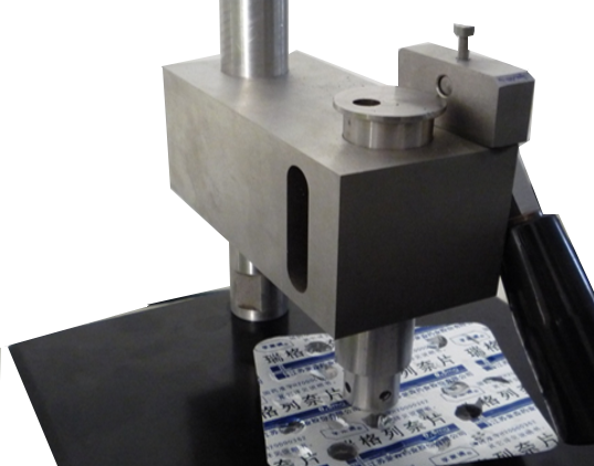 2、將被測(cè)泡罩試樣的透明側(cè)用針扎一個(gè)孔,帶鋁塑復(fù)合材料的一側(cè)朝上, 放置在測(cè)試座上。
