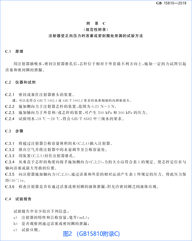 一次性無菌注射器器身密合性按照下圖2試驗(yàn)(GB15810標(biāo)準(zhǔn)中的附錄C),活賽或密封圈處應(yīng)無液體泄漏現(xiàn)象;