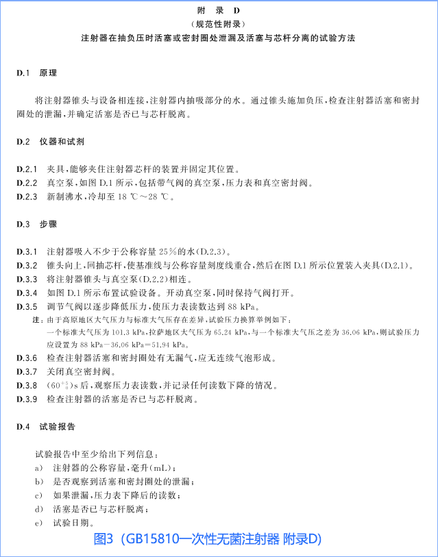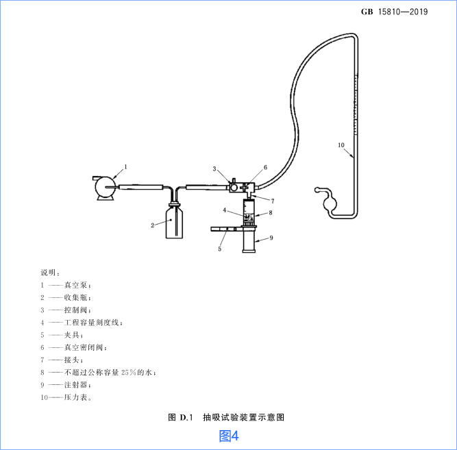 按照下圖3開展試驗(yàn)(GB15810標(biāo)準(zhǔn)中的附錄D),活塞或密封圈處應(yīng)無氣體泄漏現(xiàn)象,且壓力表的讀數(shù)不應(yīng)持續(xù)下降。抽吸示意圖參考圖4(GB15810標(biāo)準(zhǔn)中的圖D.1)。