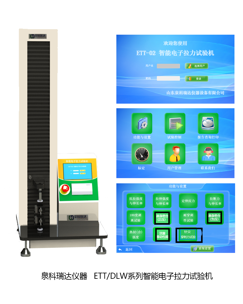 山東泉科瑞達(dá)儀器作為醫(yī)療器械械檢測(cè)儀器的專業(yè)制造、供應(yīng)商,其ETT-01、ETT-02以及DLW-02系列智能電子拉力試驗(yàn)機(jī)可通過定制不同工裝夾具一機(jī)多用,可以實(shí)現(xiàn)針尖穿刺力的專業(yè)檢測(cè)。智能電子拉力試驗(yàn)機(jī)測(cè)試性能符合GB15810-2019標(biāo)準(zhǔn),試驗(yàn)速度任意可調(diào)(尤其可實(shí)現(xiàn)超低速無沖擊運(yùn)行),拉壓雙向試驗(yàn)?zāi)J剑约俺呒?jí)精度,通過不同工裝夾具滿足測(cè)試需求,功能菜單可查看圖9。